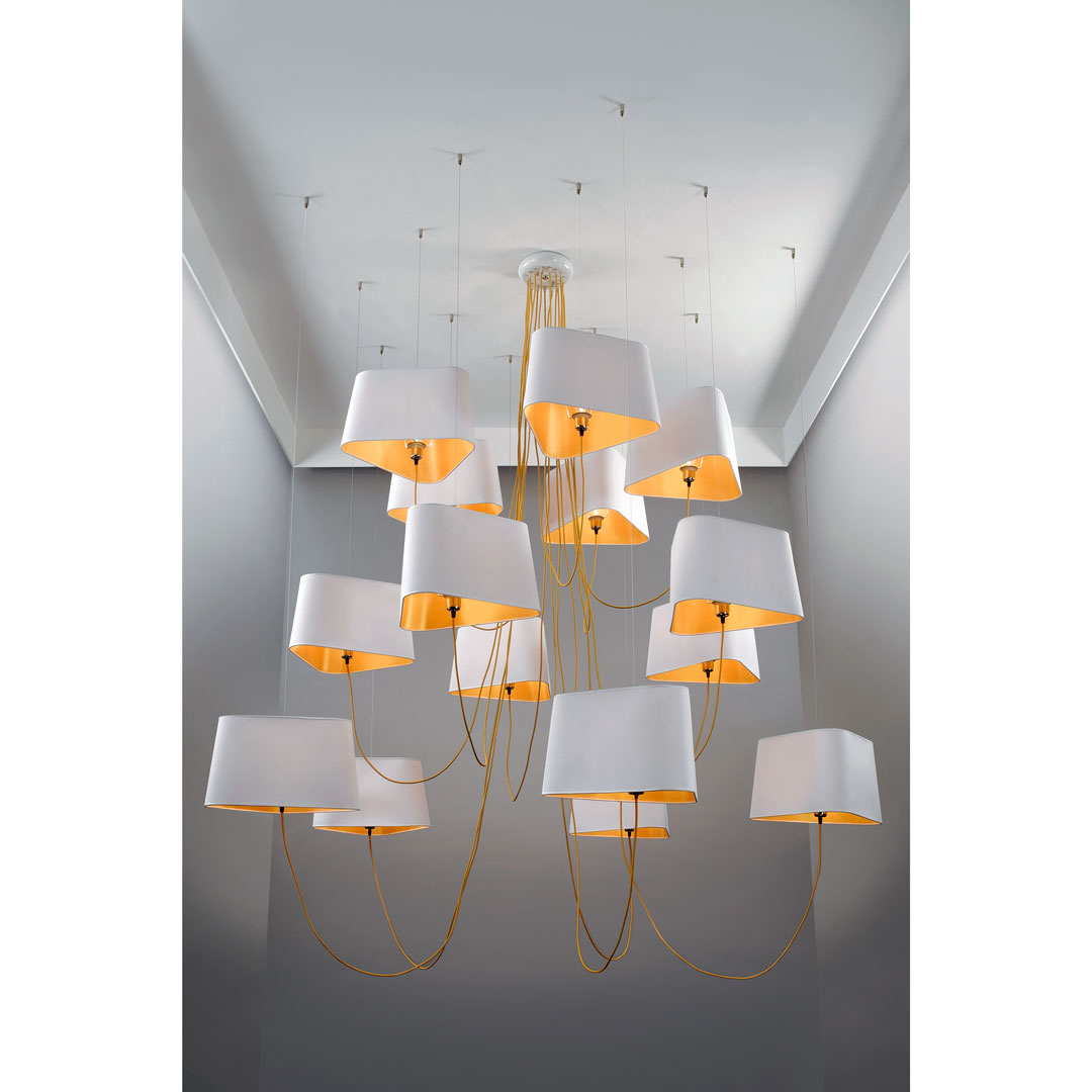 Colgante E 27 15 Luces con cable textil y pantalla triangular de lino.