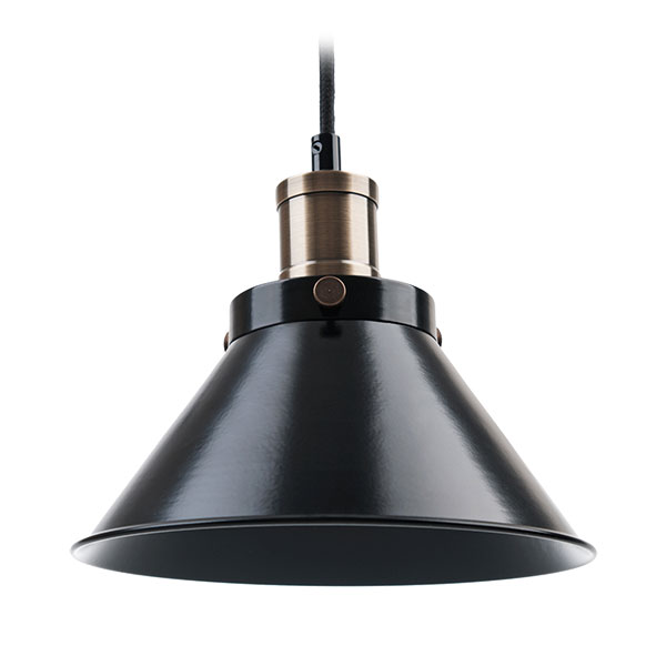 Colgante construido en acero. Portalámpara E27. Terminación en pintura horneada, terminación del florón y capuchón superior bronce viejo, con cable textil negro.