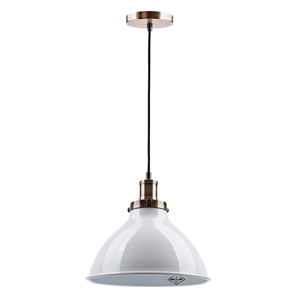 Colgante construido en acero. Portalámpara E27. Terminación en pintura horneada, terminación del florón y capuchón superior bronce viejo, con cable textil negro.