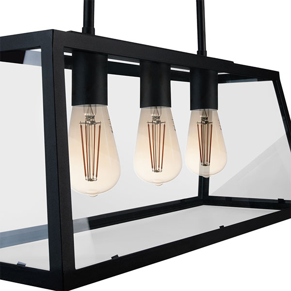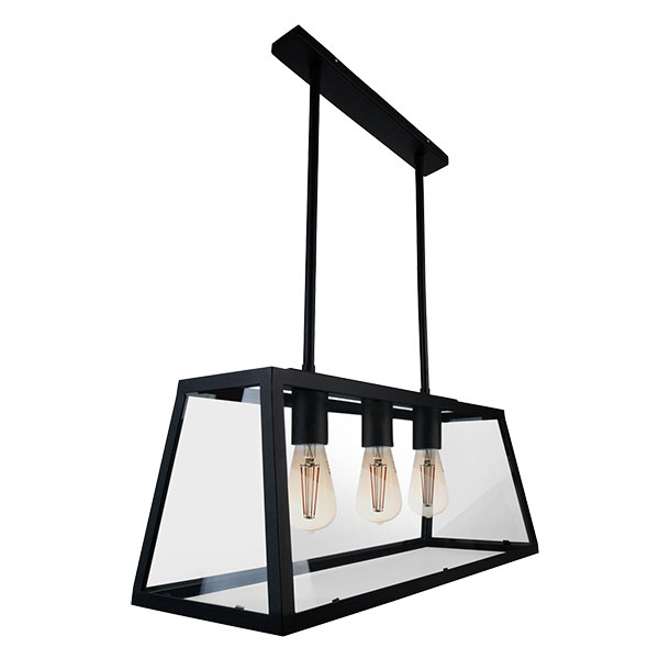 Farol en planchuela de hierro con vidrio transparente, barrales de 50 cm de largo. Portalámpara E27.